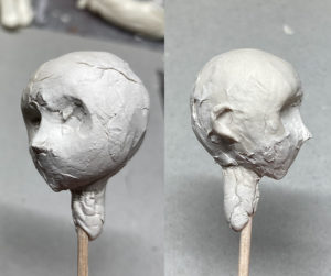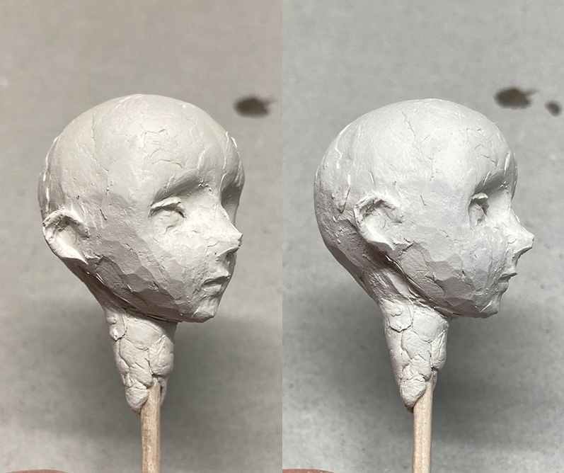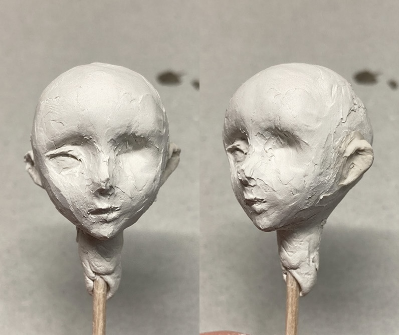 5.固まってから目や鼻、口などを作り込んでいきますが、最初は利き手と反対側から作ると手で隠れないのでやりやすいです(右利きなら向かって左側から)。耳を先に簡単にでも作っておくと、顎のラインを作る目安になり、顔の輪郭が作りやすくなります。