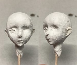 4.頭部も中に芯は入れず、ファンドを丸めておきます。目の位置はだいたい真ん中くらいで、斜めから見た時にリアル寄りではなく、二次元作品寄りのラインになるように額と顎のラインを作っていきます。