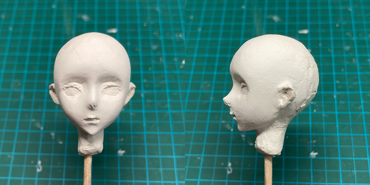 1.片側がある程度できたら、完全に作り込む前に反対側もだいたいの形を出します。片方だけ先に作り込んでしまわず両方の進捗を合わせて進めたほうが、個人的には思ったイメージに近づけやすい気がするためです。後頭部は丸いほうが首とつながった時に綺麗にS字ラインが出るので大きめにします。