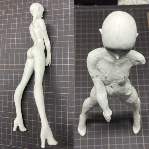 3.腕を体に付けたり、自立するようにヒールを付けたりしています。自立自体にはあまりこだわる必要はないのですが(最終的に服や髪、装飾でバランスが変わったりするので)作業のしやすさがありますので、ひとまず。足の裏に粘土を付けて立たせて、床と足の裏が設置する部分が平らの状態で乾かしてやって、その後造形すると立たせやすいです。
