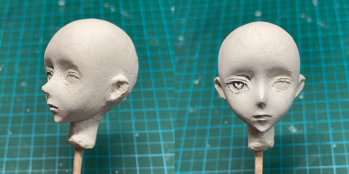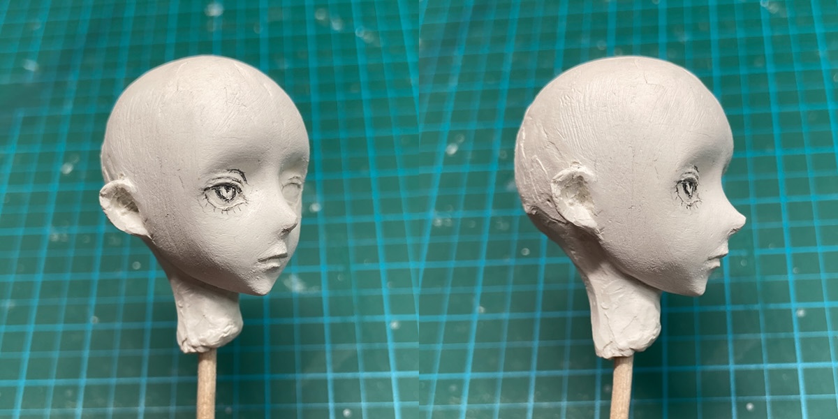 2.両方のバランスがある程度取れたら、利き手と反対側の目を進めていきます。鼻や口、輪郭も少しずつ整えていきます。鼻は正面から見た時は小鼻が目立たないように、横から見た時に綺麗なラインになるように、正面と横の整合性を考えつつ作ります。鼻の高さより口が高くならないように(いわゆるEライン)を意識しますが、場合によってラインのバランスは変えたりします。