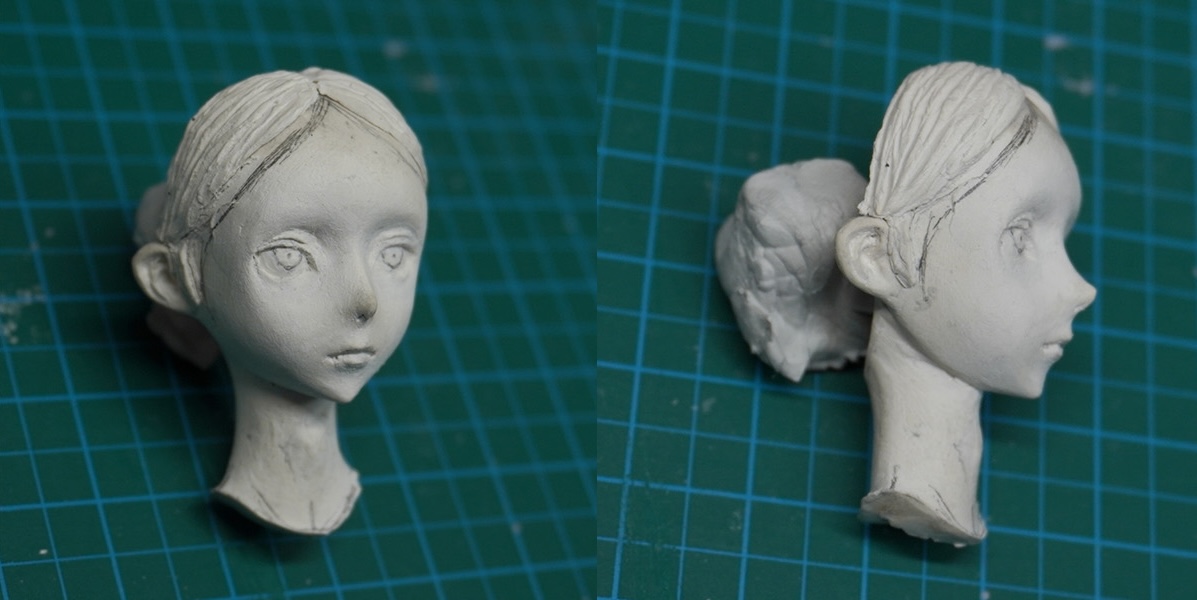 体を作る際、頭部をいったん体とつなげて制作を進めます。そのほうが頭~首~体が自然につながるように造形しやすいためです。全体の流れが決まった後に分割ラインを考慮して頭部を切り離し、顔などの細部を詰めていきます。