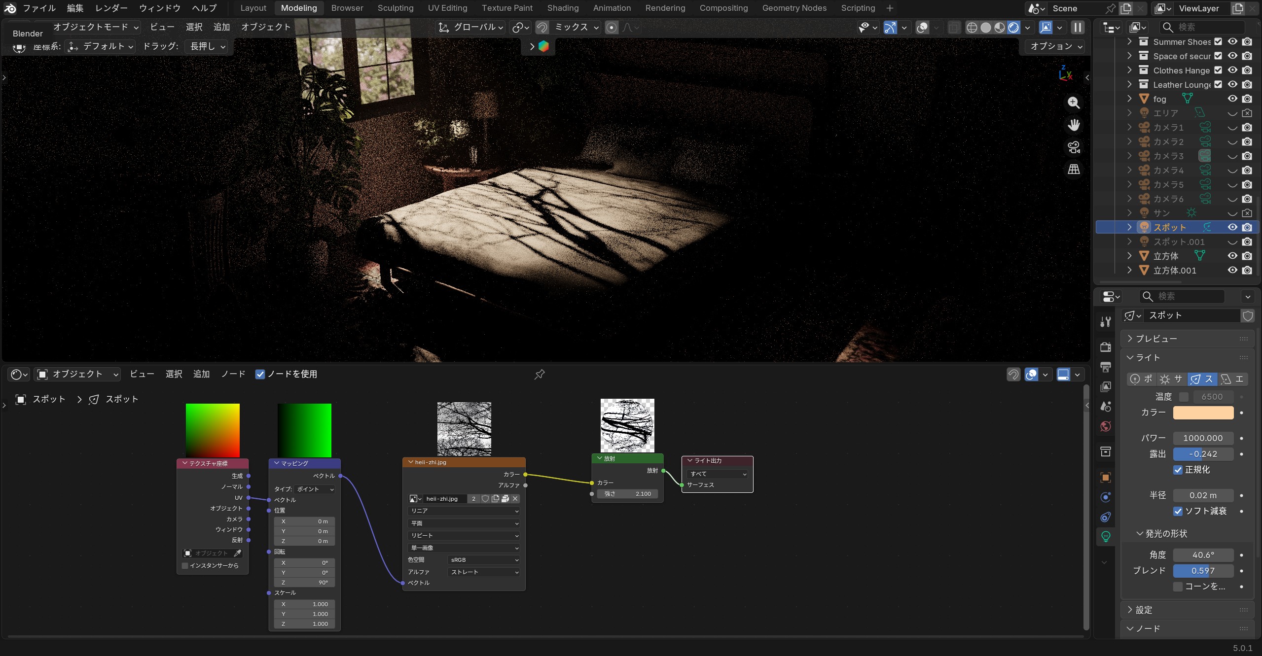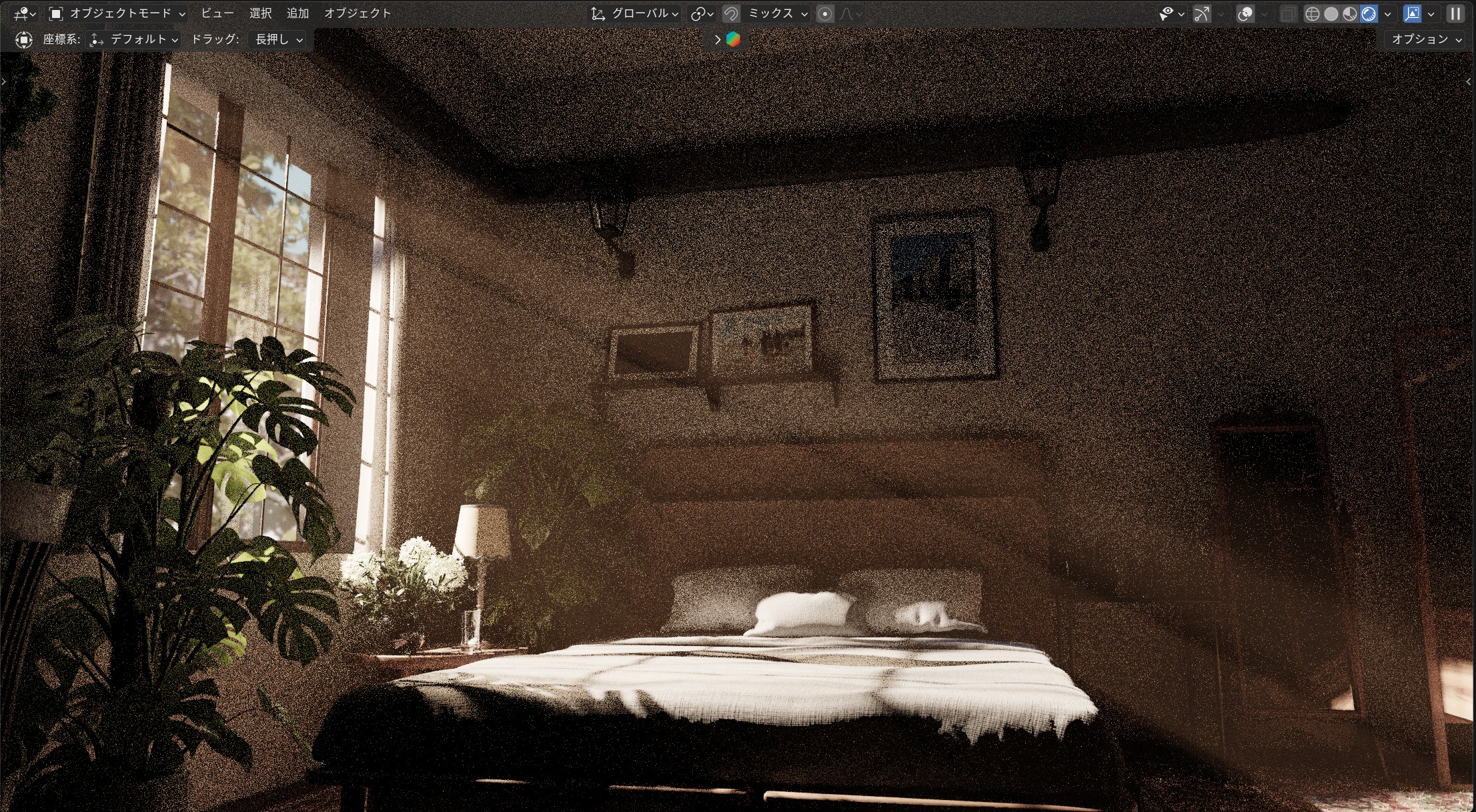 ここからはBlenderでゴボライトを活用する方法について解説します。今回はこちらのシーンのような、窓から木漏れ日が差し込む光を作ります。