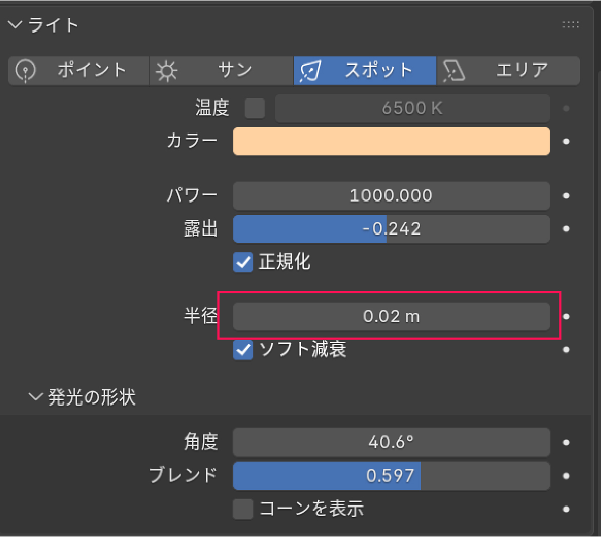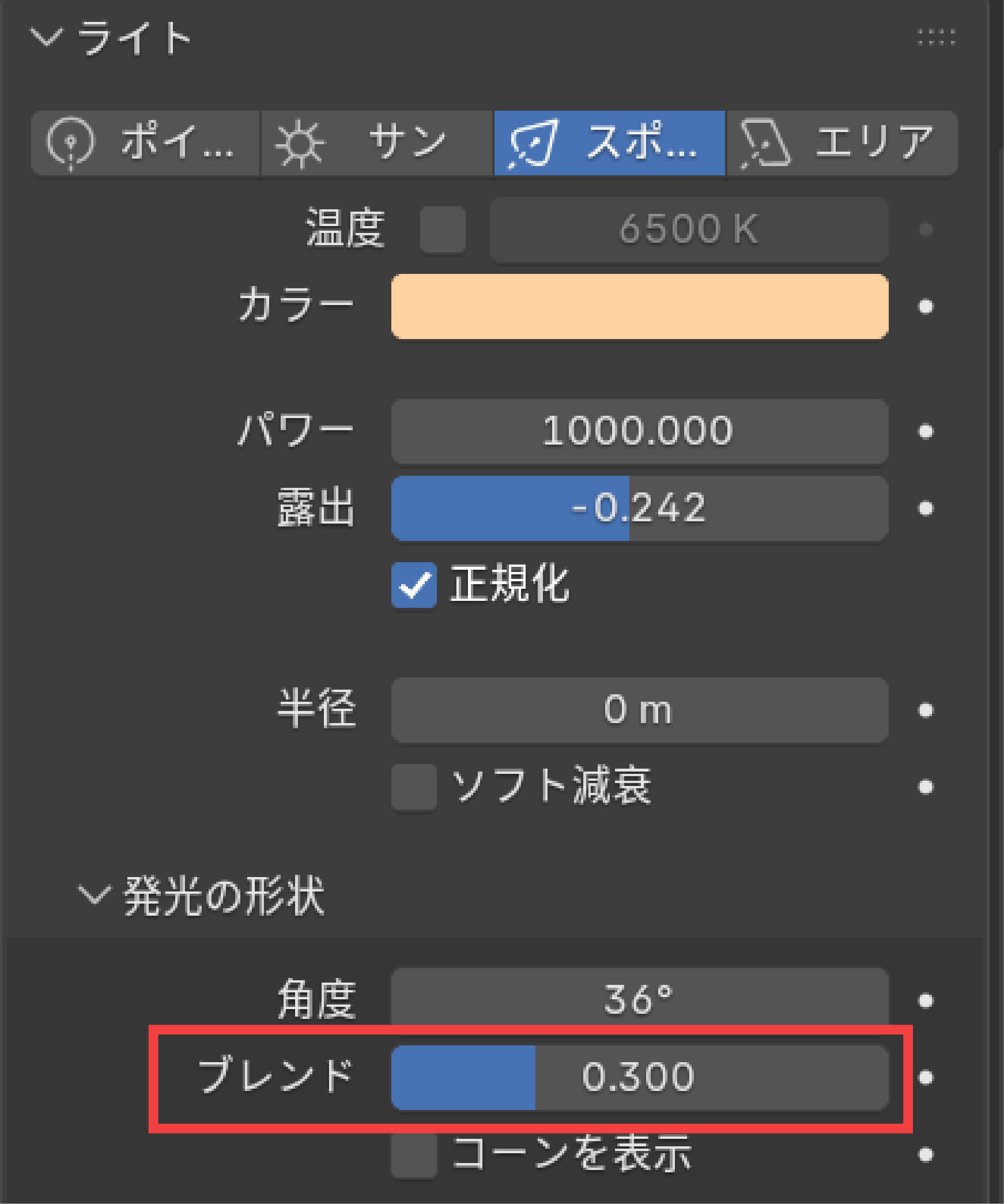おそらく、スポットライトを配置した場合の初期値は、ブレンドが0になっているかと思います。ブレンドは、スポットライトが作り出す光と影の境目をなじませる効果があります。