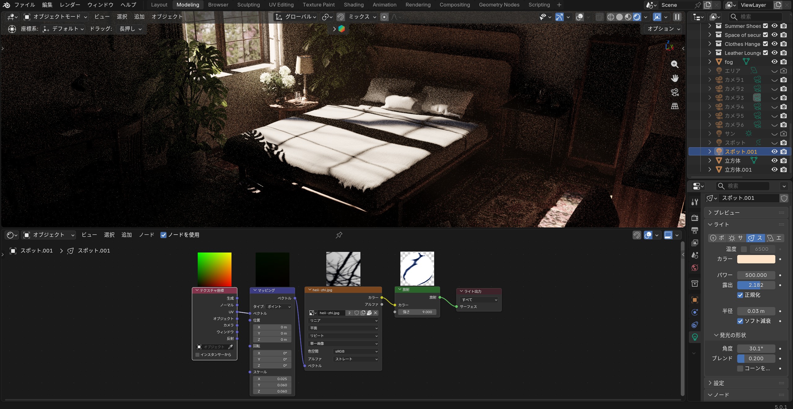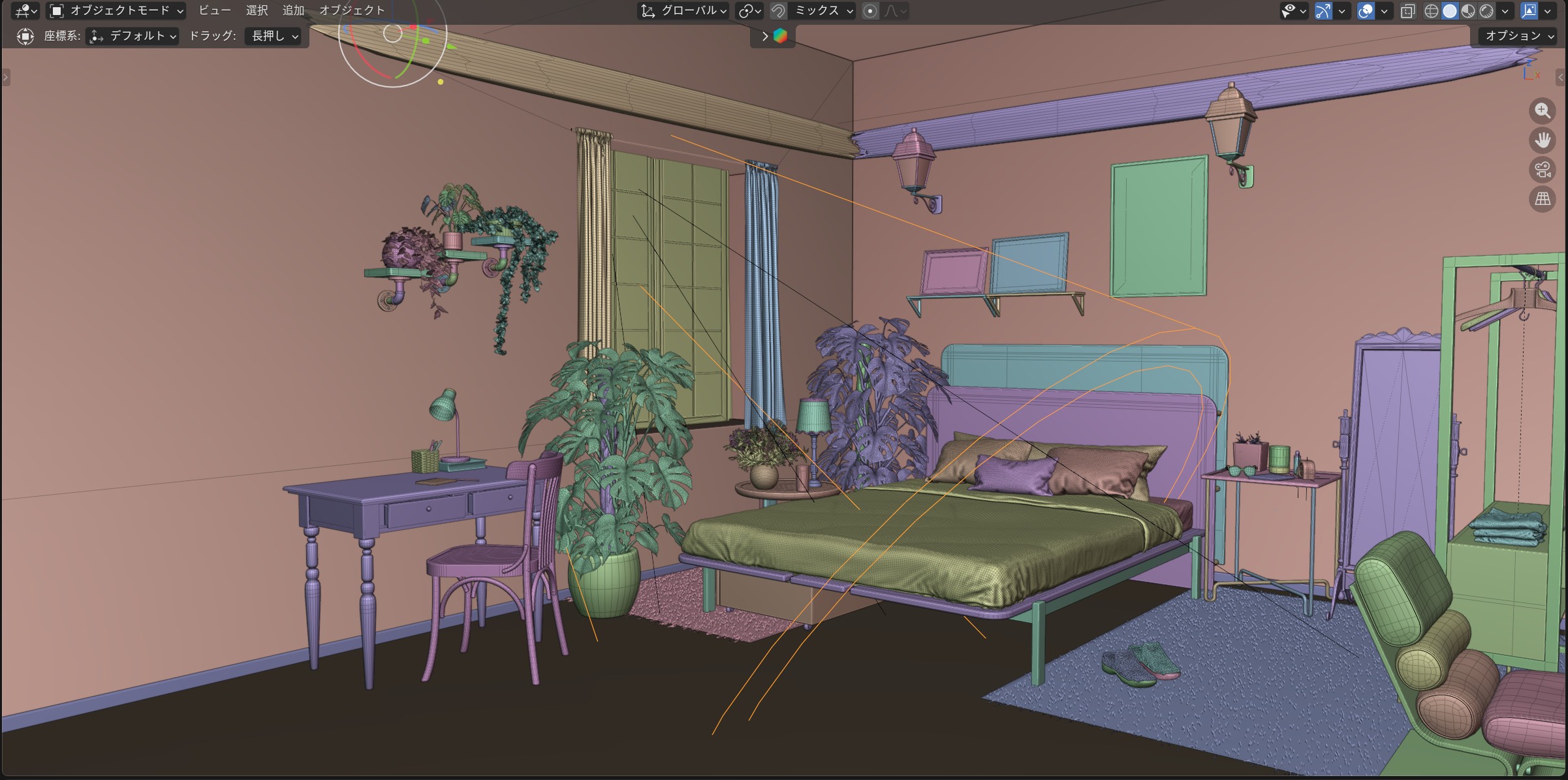 家具を配置し、それぞれのマテリアル・テクスチャを調整した状態まで仕上げます。(今回はライティングがメインのため、モデリング・シェーディング手法は割愛させていただきました)