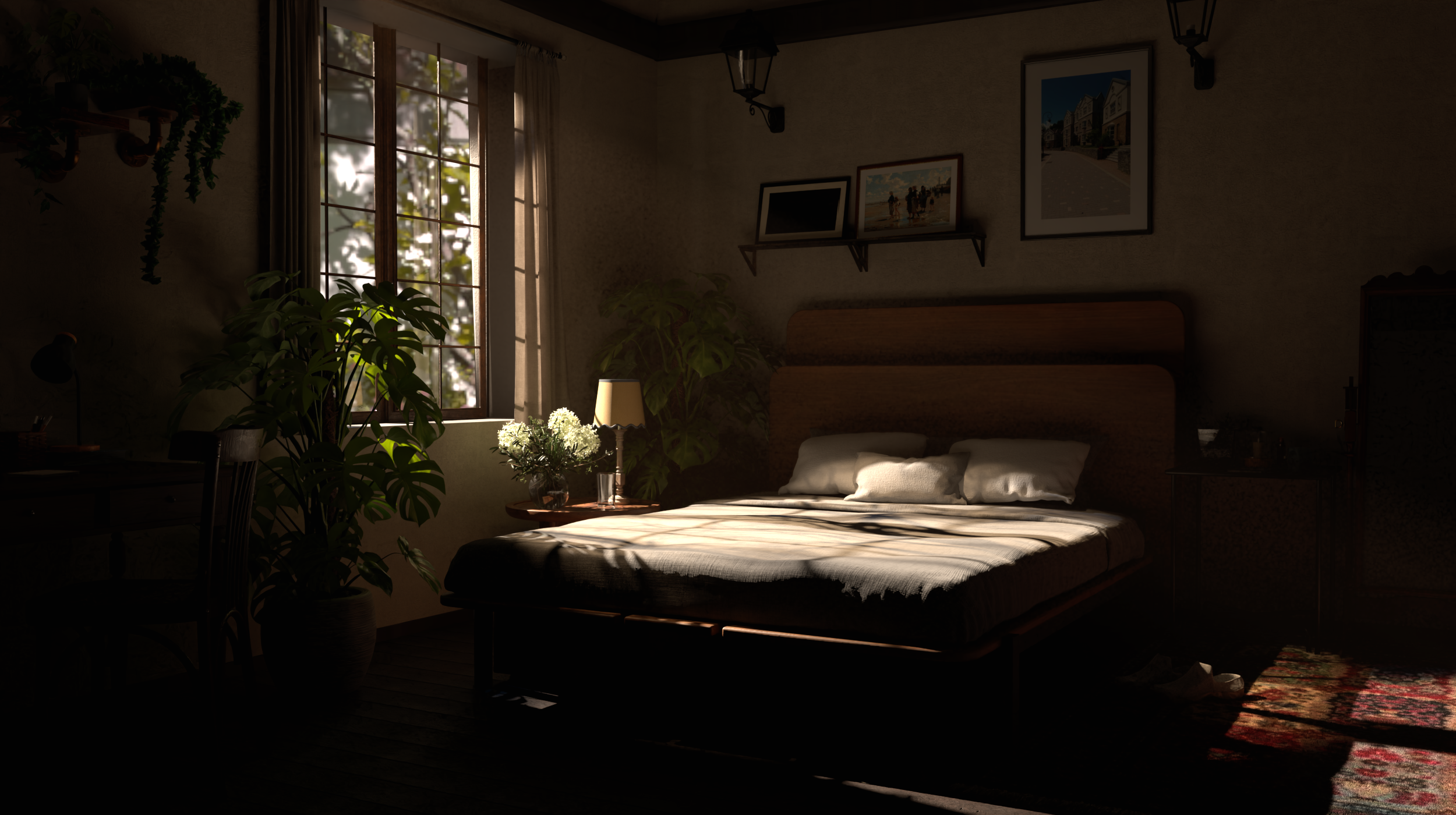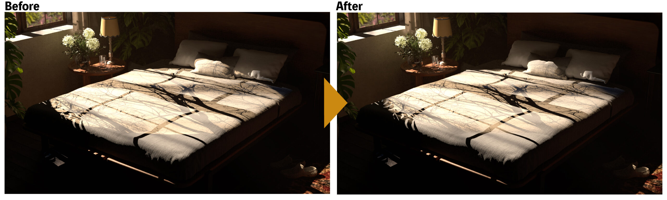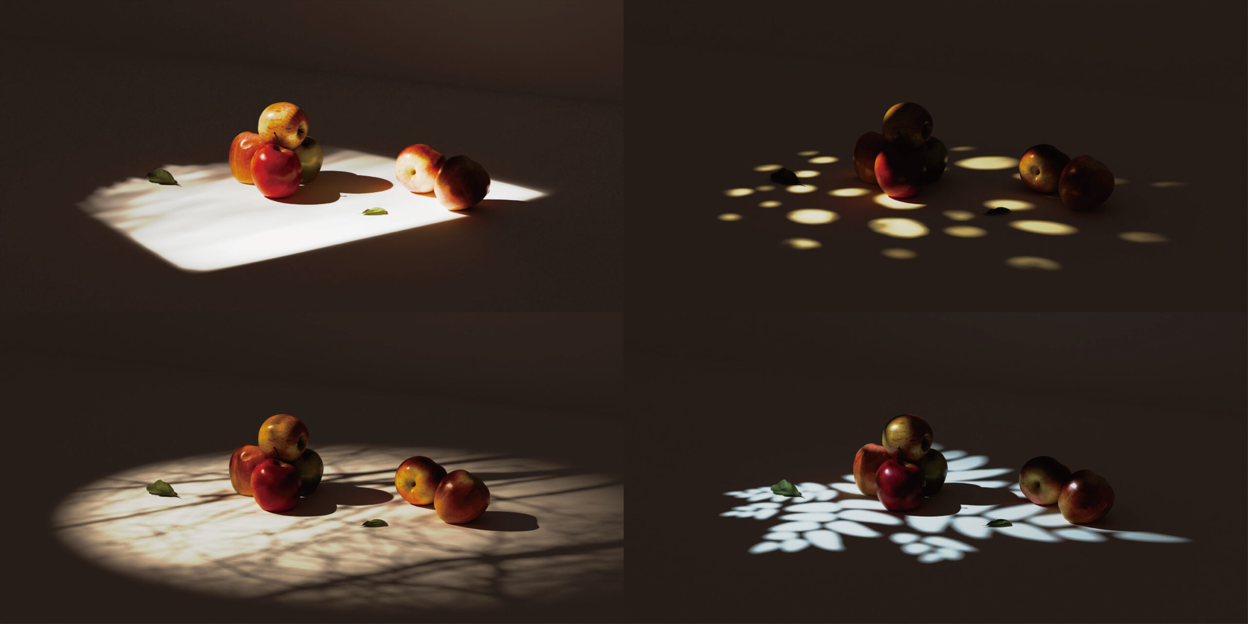 CGを制作していると、オブジェクトをコントロールして影を落とすことが難しいケースや、見せたい場所、シーンに合わせて影を意図的に作り出したいケースがあります。そんな時は、このゴボライトを活用して、まるで、ベッドの上に枝葉の影が落ちているように見せたりすることができます。実際の3Dシーンの中に木は置かれていません。それでも、「この近くに木がある」と感じられるのがゴボライトの力です。